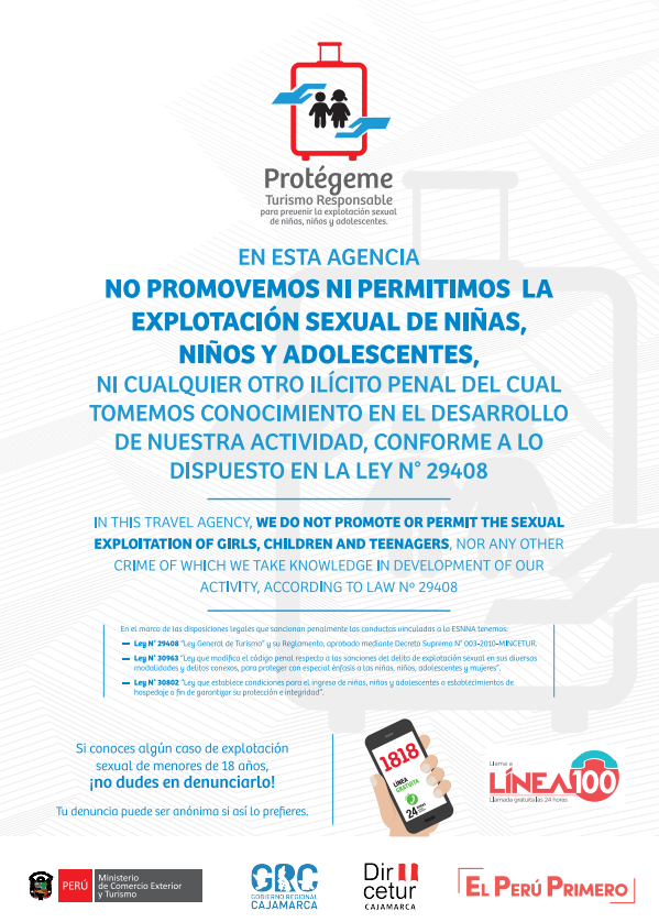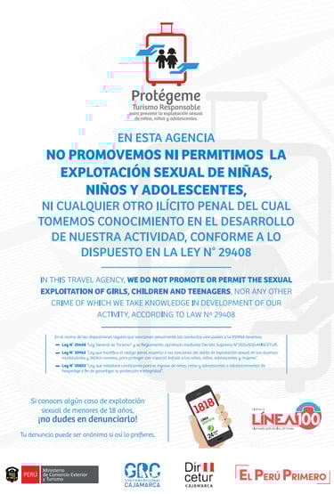 In compliance with Law No. 29408 and Law No. 30963, ANDEAN EXPERIENCES IN CUSCO E.I.R.L. rejects all forms of sexual exploitation of children and adolescents. We inform our guests that such crimes are severely punished by Peruvian law with imprisonment. We are committed to reporting any suspicious activity to the authorities (Line 1818 or Line 100).